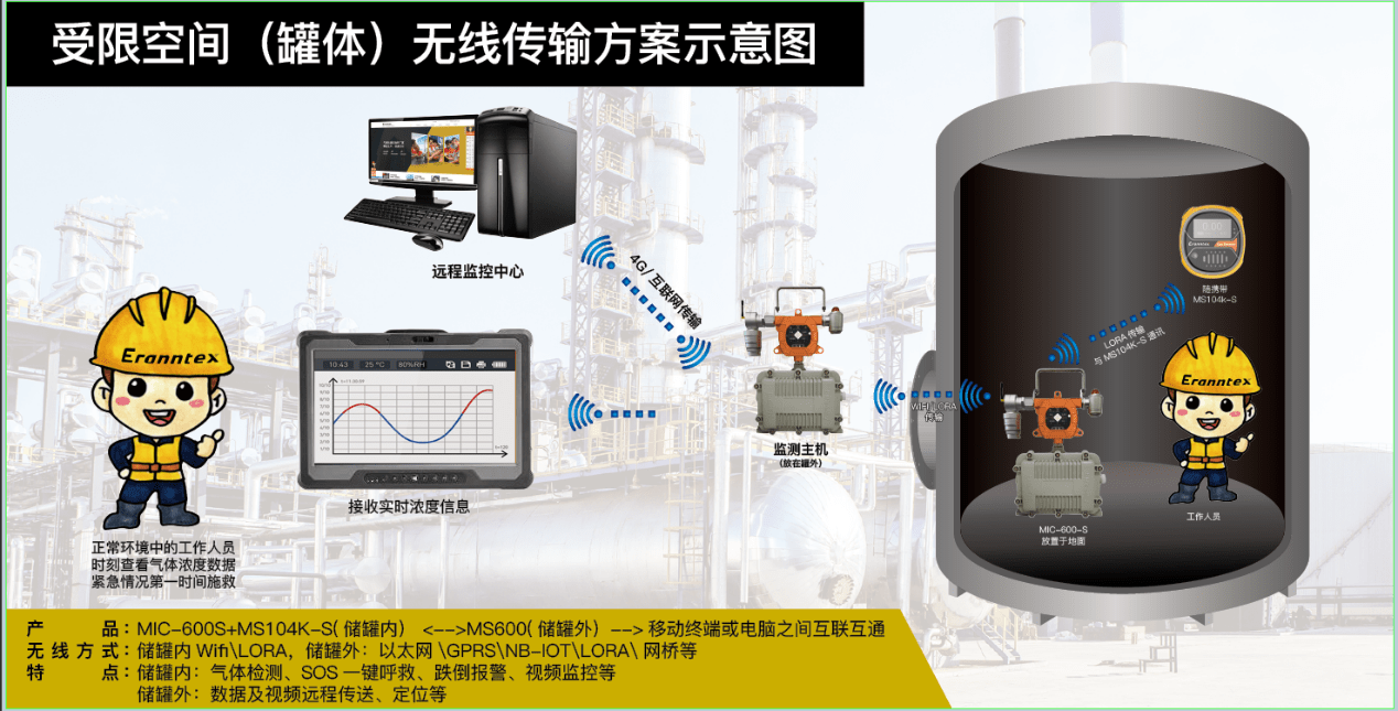 今天,我們就以氣體檢測行業(yè)的老大哥逸云天Eranntex為例,來說說如何進行受限空間的氣體檢測。首先,在進入受限空間作業(yè)前,工作人員會先用逸云天MIC-600S主機或泵吸式MS600對受限空間采樣檢測,以檢測密閉空間中的氧氣、硫化氫、可燃氣、VOC揮發(fā)性有機化合物等。確定安全后,工人才可以進入作業(yè)。作業(yè)中,逸云天MIC-600S監(jiān)測主機在罐體外,將攝像頭架設(shè)在受限空間,工人佩戴一臺逸云天便攜式檢測儀MS600進行作業(yè),隨時檢測所處環(huán)境的氣體濃度狀況,外邊監(jiān)護人員可通過手機或ipad進行查看監(jiān)測數(shù)據(jù)和視頻圖像,實現(xiàn)遠程高風(fēng)險操作一體化監(jiān)管,徹底解決行業(yè)痛點。