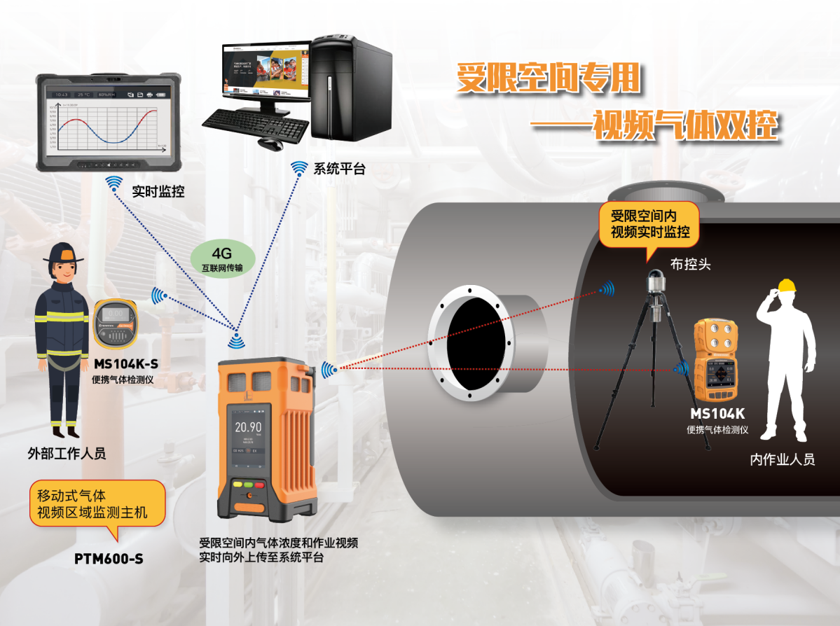 針對受限空間作業(yè)生產(chǎn)這塊,逸云天推出了無線互聯(lián)受限空間監(jiān)測氣體預警系統(tǒng)技術方案——在進入受限空間作業(yè)前,作業(yè)人員先用移動式PTM600-S對受限空間進行采樣檢測,以檢測密閉空間中的氧氣,硫化氫和可燃氣,也可以檢測密閉空間的VOC揮發(fā)性有機化合物。確定安全后,工人可以進入作業(yè)。作業(yè)中,監(jiān)測主機在受限空間外,施工工人佩戴一臺便攜式檢測儀MS104K進行作業(yè),隨時檢測所處環(huán)境的氣體濃度狀況,可布設防爆攝像頭于內(nèi)部,外邊監(jiān)護人員可通過手機或ipad進行查看監(jiān)測數(shù)據(jù)和視頻圖像。必要時,可在內(nèi)部增加中繼設備延長傳輸距離。實現(xiàn)了遠程高風險操作一體化監(jiān)管,徹底解決行業(yè)痛點。
