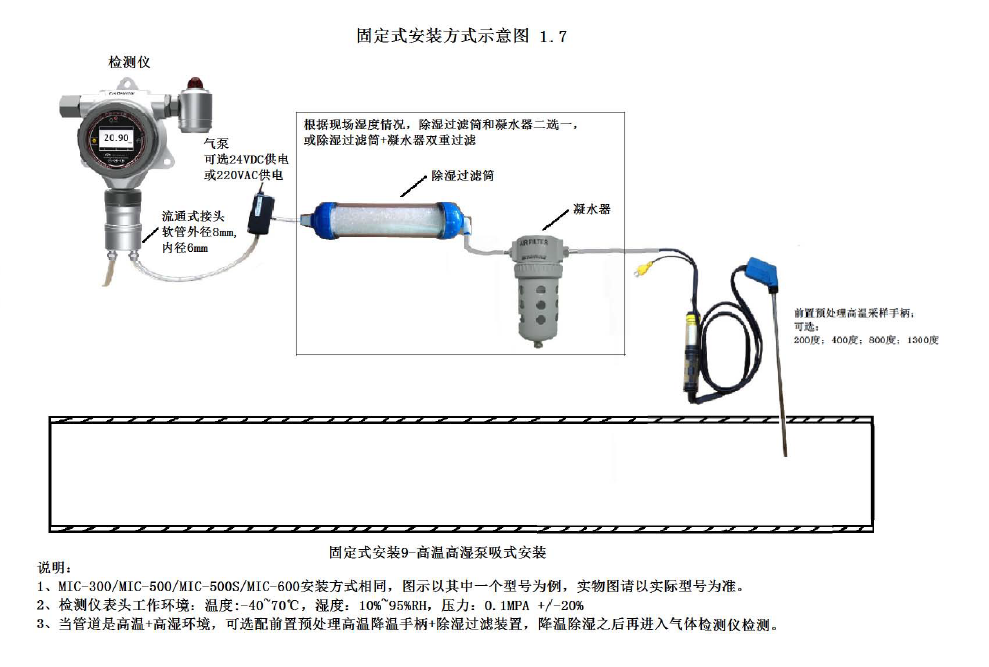 采樣單元采集現(xiàn)場的被測氣體,預(yù)處理單元對氣體進(jìn)行除濕、過濾粉塵,并將被測氣體的濕度恒定在一定范圍,處理后的氣體接入我司MIC-500-CO檢測儀(配流通接頭)進(jìn)氣口,進(jìn)行實時監(jiān)測并顯示在儀器上,并通過信號接口將數(shù)據(jù)進(jìn)行傳輸?shù)娇蛻舻谋O(jiān)測系統(tǒng)進(jìn)行數(shù)據(jù)監(jiān)控。