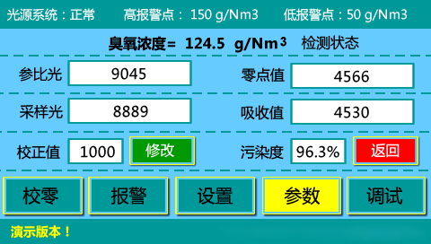 臭氧分析儀帶有觸摸屏操作界面,實(shí)時(shí)顯示臭氧氣體的濃度,帶有壓力和溫度補(bǔ)償及顯示,可設(shè)置自動(dòng)校零時(shí)間和手動(dòng)校零模式。高濃度(g/Nm3)量程帶有流量輸入功能,可實(shí)時(shí)顯示臭氧發(fā)生器的產(chǎn)量。帶有兩組繼電器信號(hào)輸出,用戶可自由選擇高報(bào)警點(diǎn)和低報(bào)警點(diǎn)信號(hào)輸出連接。核心部件采用紫外長(zhǎng)壽命光源系統(tǒng),采用高透光率石英片,保證零點(diǎn)的穩(wěn)定性,防止零點(diǎn)漂移影響檢測(cè)濃度的準(zhǔn)確性。根據(jù)國(guó)外光池技術(shù)設(shè)計(jì)的耐壓力,耐沖擊的獨(dú)立光池結(jié)構(gòu),校零操作時(shí)氣體流量、壓力、流速保持不變,防止氣流沖擊對(duì)校零產(chǎn)生影響,無(wú)需關(guān)閉臭氧進(jìn)氣可完成校零操作,保證設(shè)備可以每天24小時(shí)連續(xù)運(yùn)行。