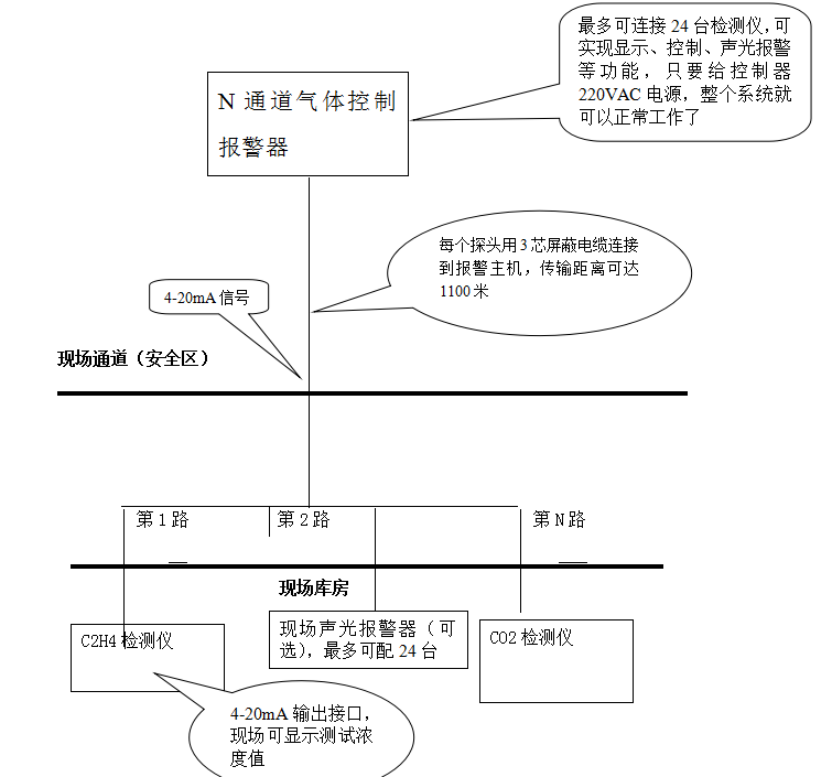 現(xiàn)場(chǎng) C2H4和CO2變送器傳過(guò)來(lái)的4-20mA信號(hào)全部連接到N通道氣體控制報(bào)警器上,當(dāng)某一路C2H4和CO2檢測(cè)儀發(fā)出報(bào)警信號(hào)時(shí)(同時(shí)有繼電器輸出,可觸發(fā)風(fēng)機(jī)或乙醇產(chǎn)生機(jī)開關(guān)),提供給監(jiān)控人員分級(jí)的聲光報(bào)警,如果有需要,可以將監(jiān)控主機(jī)通過(guò)網(wǎng)絡(luò)將數(shù)據(jù)傳輸?shù)狡渌O(jiān)控中心。在現(xiàn)場(chǎng)可以實(shí)時(shí)顯示C2H4和CO2的濃度,也可以在每一個(gè)探頭附近裝一個(gè)聲光報(bào)警器,當(dāng)現(xiàn)場(chǎng)發(fā)生報(bào)警時(shí)可以通知人員快速處理或撤離。